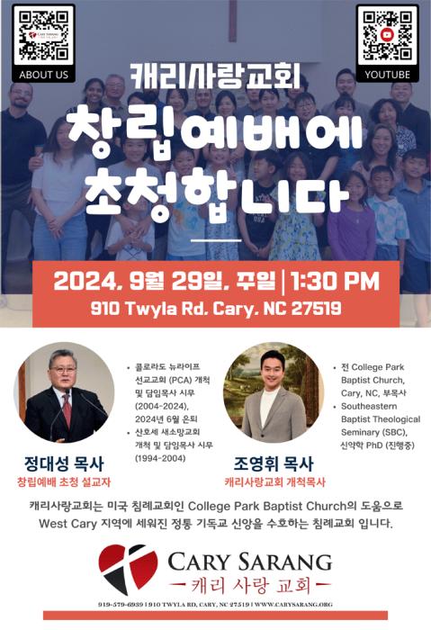 교회 주소는 910 Twyla Rd. Cary, NC 27519이다. 많은 교민들의 참석과 격려를 바라고 있다.