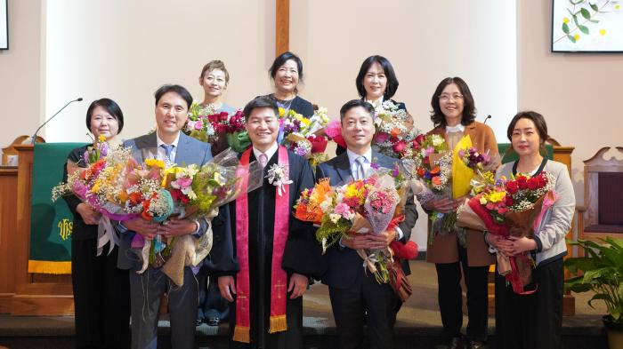 빈옥명 장로 안수와 강유희 집사, 서영태집사, 정미경집사가 새로 안수집사로 또한 이미 안수를 받은 김규빈 집사, 김지영집사, 류엘 집사, 박희전 집사가 시무 제직으로 임직했다.
