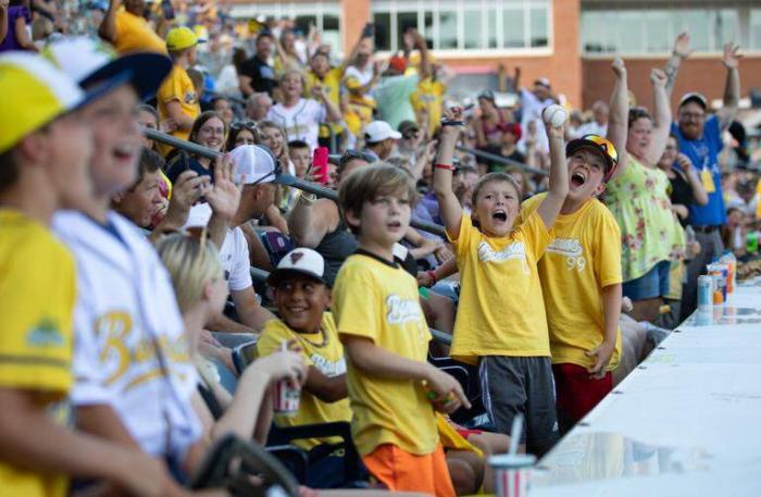 <더램의 더램 불스 애슬레틱 파크에서 열린 야구 경기 중 어린이들이 자기가 좋아하는 팀을 응원하고 있다>